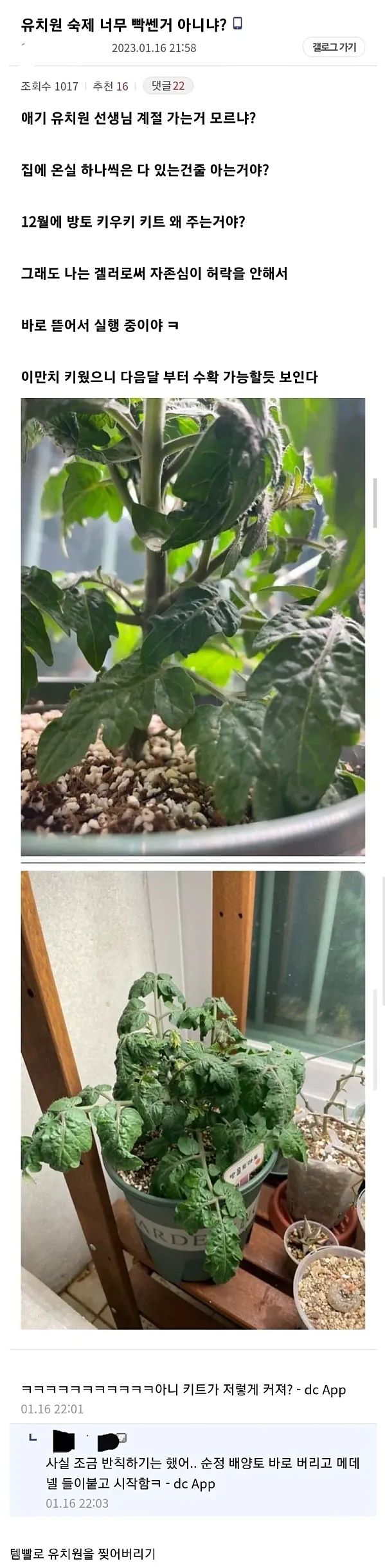 겨울에 방울토마토 키우기 숙제를 준 유치원에 분노한 부모 작성자 정보 하프라인 작성 작성일 2026.02.21 13:12 컨텐츠 정보 234,577 조회 목록 본문 킹치만 부모님이 식물갤러였고 관련자료 댓글 0 등록된 댓글이 없습니다. 로그인한 회원만 댓글 등록이 가능합니다. 목록