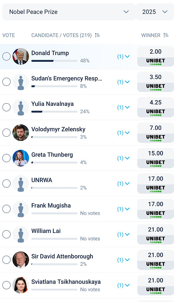 노벨평화상 배당률 근황 작성자 정보 토렉스 작성 작성일 2025.10.07 12:03 컨텐츠 정보 330,257 조회 목록 본문 실제로 트럼프가 노벨평화상을 받을 일은 없겠죠? 노벨평화상 배당률 근황 관련자료 댓글 0 등록된 댓글이 없습니다. 로그인한 회원만 댓글 등록이 가능합니다. 목록