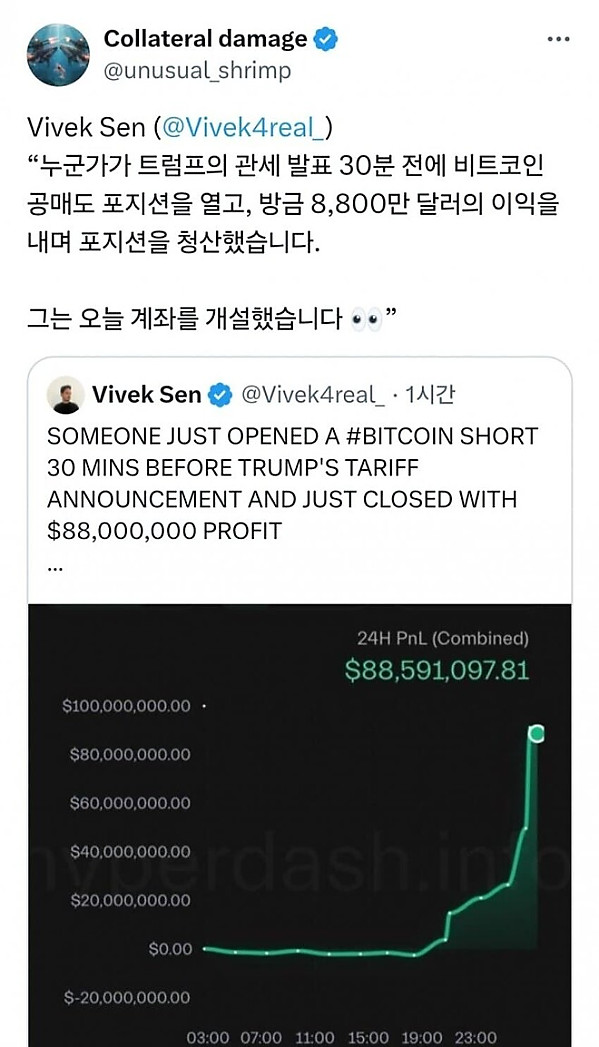 트럼프의 관세발표 30분 전에 공매도 포지션을 열고 1200억원을 번 사람