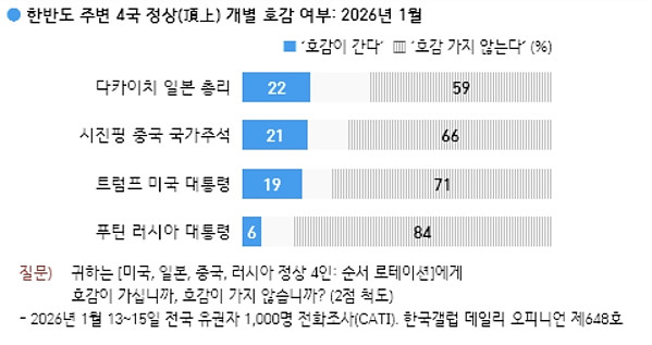 한국인이 가장 호감을 갖는 지도자는 다카이치 총리 작성자 정보 하프라인 작성 작성일 2026.01.17 19:44 컨텐츠 정보 184,541 조회 목록 본문 '주변국 4인방중에서'/ 조사 개요· 조사기간: 2026년 1월 13~15일· 표본추출: 이동통신 3사 제공 무선전화 가상번호 무작위 추출· 응답방식: 전화조사원 인터뷰(CATI)· 조사대상: 전국 만 18세 이상 1,000명· 표본오차: ±3.1%포인트(95% 신뢰수준)· 접촉률: 45.5%(전체 투입 유효 번호 대비 통화 연결)· 응답률: 11.9%(총통화 8,382명 중 1,000명 응답 완료)· 의뢰처: 한국갤럽 자체 조사 관련자료 댓글 0 등록된 댓글이 없습니다. 로그인한 회원만 댓글 등록이 가능합니다. 목록