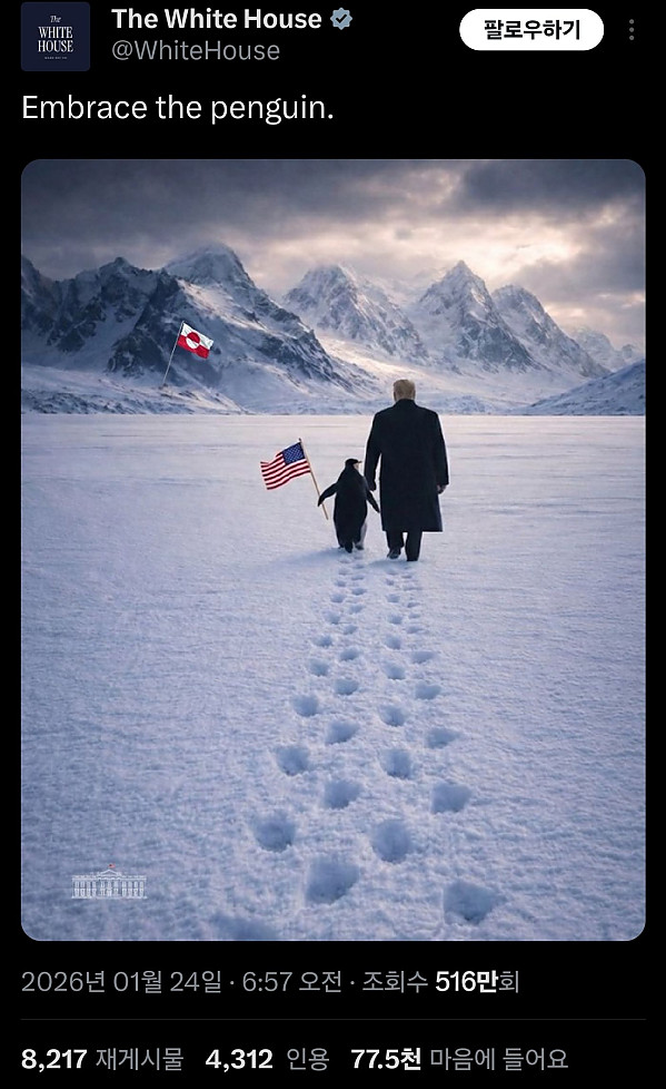 펭귄을 포용하라는 백악관 트위터 작성자 정보 하프라인 작성 작성일 2026.01.25 19:29 컨텐츠 정보 208,585 조회 목록 본문 https://twitter.com/WhiteHouse/status/2014819683757678654?s=20북반구에는 펭귄이 안사는데? 관련자료 댓글 0 등록된 댓글이 없습니다. 로그인한 회원만 댓글 등록이 가능합니다. 목록