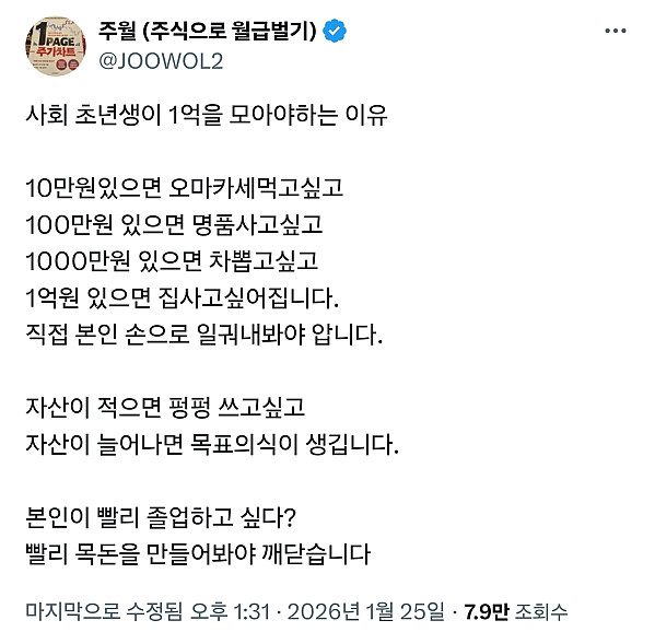 사회 초년생이 1억을 모아야하는 이유 작성자 정보 하프라인 작성 작성일 2026.01.27 13:47 컨텐츠 정보 7,032 조회 목록 본문 공감 관련자료 댓글 0 등록된 댓글이 없습니다. 로그인한 회원만 댓글 등록이 가능합니다. 목록