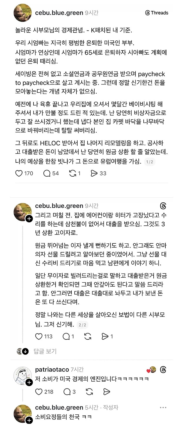 상식이 다른 미국 시부모님의 경제관념 작성자 정보 하프라인 작성 작성일 2026.02.05 13:53 컨텐츠 정보 214,435 조회 목록 본문 미국인은 저축 따윈 안한다네~ 관련자료 댓글 0 등록된 댓글이 없습니다. 로그인한 회원만 댓글 등록이 가능합니다. 목록