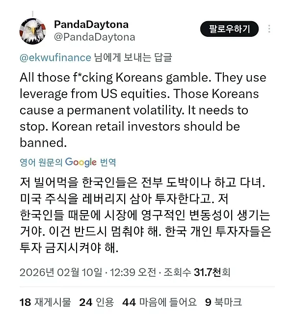 미국 개인투자자들이 최근에 빡친 이유 작성자 정보 하프라인 작성 작성일 2026.02.11 15:23 컨텐츠 정보 3,125 조회 목록 본문 한국의 서학개미들때문에 저렇게 빡쳤다고 하네요 관련자료 댓글 0 등록된 댓글이 없습니다. 로그인한 회원만 댓글 등록이 가능합니다. 목록