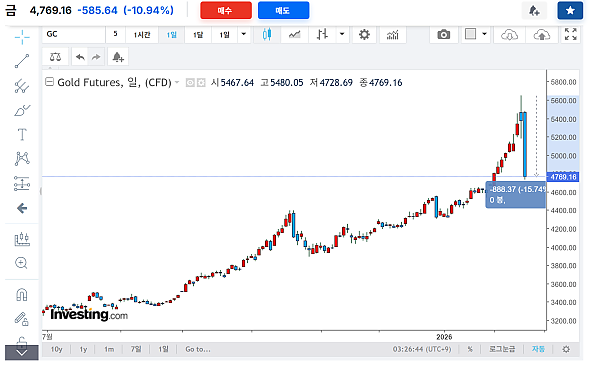 안전자산 골드 근황 작성자 정보 하프라인 작성 작성일 2026.02.02 16:39 컨텐츠 정보 211,434 조회 목록 본문 <일봉>코스피보다 더 빠르고 가파르게 5000 돌파 하고, 5500까지 단숨에 올랐던 골드가단 2일만에 15%, 오늘 기준 10% 이상 하락 중입니다.디지털 골드(BTC)는 더 분발 해야 할 듯 관련자료 댓글 0 등록된 댓글이 없습니다. 로그인한 회원만 댓글 등록이 가능합니다. 목록