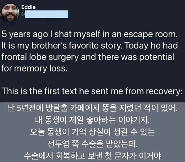 위험한 뇌수술을 마친 동생이 보낸 문자 작성자 정보 하프라인 작성 작성일 2026.02.20 16:35 컨텐츠 정보 231,594 조회 목록 본문 수술 깔끔하게 잘됐네저거 메시지 보내면서 얼마나 실실 쪼갰을까 관련자료 댓글 0 등록된 댓글이 없습니다. 로그인한 회원만 댓글 등록이 가능합니다. 목록