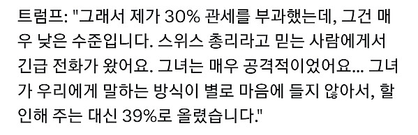 트럼프가 스위스 관세를 39%로 높였던 이유 작성자 정보 하프라인 작성 작성일 2026.02.14 11:40 컨텐츠 정보 222,731 조회 목록 본문 [스위스 총리 말투가 싸가지 없어서]이것이 세계 최강대국의 치밀하고 체계적인 관세협상이다!참고로 스위스는 총리가 없고 저때 대화상대는 스위스 대통령이었음. 관련자료 댓글 0 등록된 댓글이 없습니다. 로그인한 회원만 댓글 등록이 가능합니다. 목록