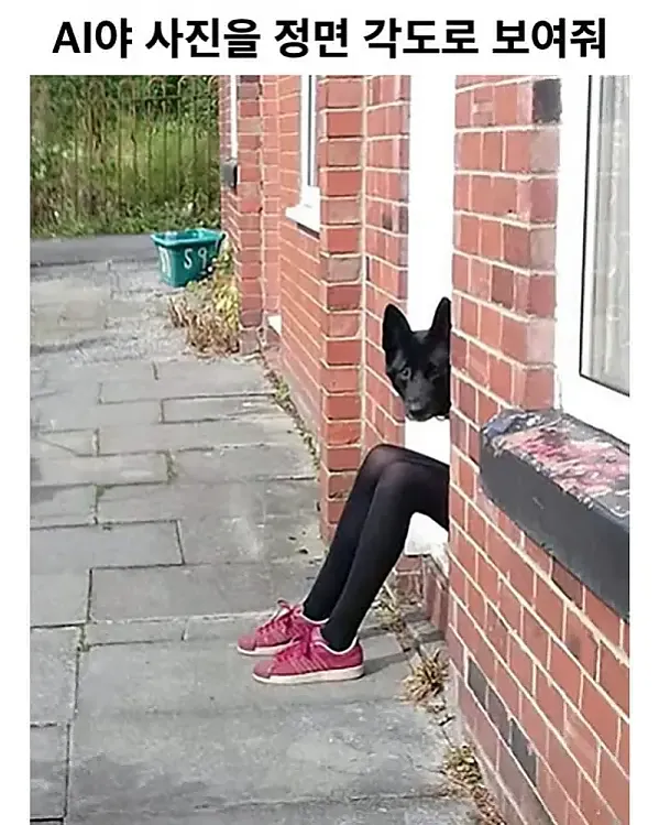 시각적 연속성 우선: AI는 이미지 내에서 색상, 질감, 윤곽의 연속성을 파악하여 물체를 정의합니다. 원본 이미지에서 검은 타이츠(또는 바지)와 검은 강아지 얼굴이 창문 틈에서 거의 끊김 없이 연결되어 나타나기 때문에, AI는 이를 **'하나의 신체'**의 일부로 인식하기 쉽습니다.