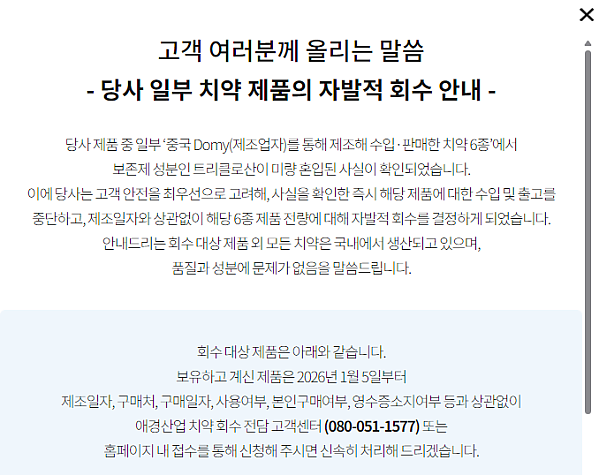 보통 마트에서 파는 덴탈크리닉이었나 그건 국산 제품이고 회수 대상은 아닙니다.