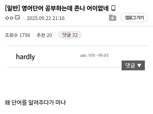 영어 공부하다 삔또 상함 작성자 정보 토렉스 작성 작성일 2025.09.23 17:21 컨텐츠 정보 125,093 조회 목록 본문 어휴.. 됐다 됐어 관련자료 댓글 0 등록된 댓글이 없습니다. 로그인한 회원만 댓글 등록이 가능합니다. 목록