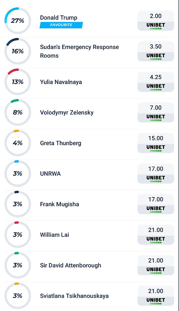 노벨평화상 배당률 근황 작성자 정보 토렉스 작성 작성일 2025.10.07 12:03 컨텐츠 정보 330,239 조회 목록 본문 실제로 트럼프가 노벨평화상을 받을 일은 없겠죠? 노벨평화상 배당률 근황 관련자료 댓글 0 등록된 댓글이 없습니다. 로그인한 회원만 댓글 등록이 가능합니다. 목록