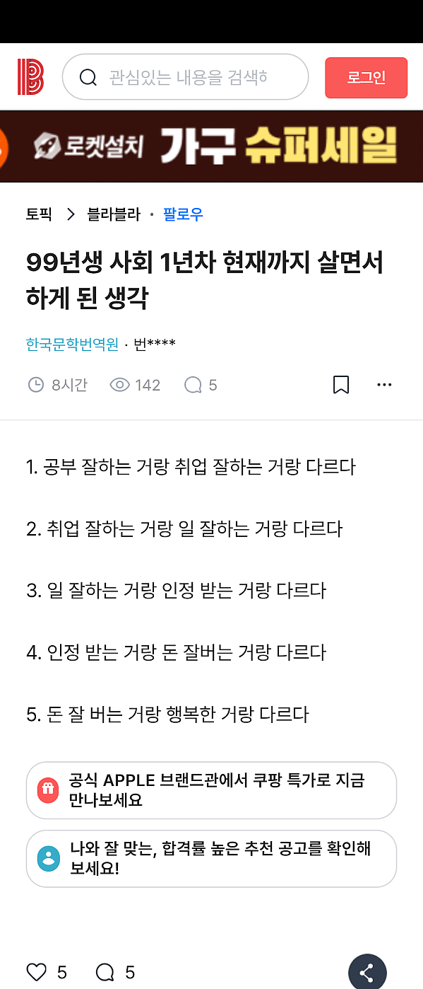 99년생 사회 1년차 현재까지 살면서 하게 된 생각 작성자 정보 토렉스 작성 작성일 2025.10.08 11:44 컨텐츠 정보 372,675 조회 목록 본문 관련자료 댓글 0 등록된 댓글이 없습니다. 로그인한 회원만 댓글 등록이 가능합니다. 목록