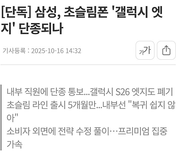 슬림단 멸망.. feat.갤럭시 작성자 정보 토렉스 작성 작성일 2025.10.17 16:32 컨텐츠 정보 160,247 조회 목록 본문 엣지 단종ㅜㅠ얇은거보다 배터리,성능,크기를 우선시하는 대중들의 성향은 바뀌지 않은둣아이폰 에어는 과연.. 관련자료 댓글 0 등록된 댓글이 없습니다. 로그인한 회원만 댓글 등록이 가능합니다. 목록