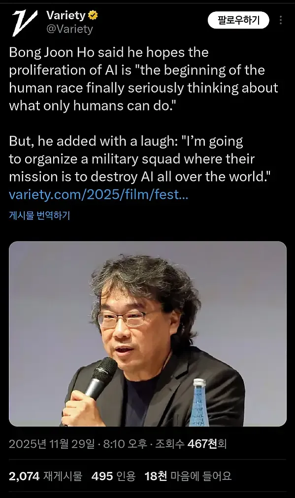 Ai시대, 봉준호의 답변 작성자 정보 토도사 작성 작성일 2025.12.01 21:59 컨텐츠 정보 182,384 조회 목록 본문 봉준호 감독은 Ai의 확산이 인류가 마침내 '오직 인간만이 할 수 있는 일은 무엇인가'에 대해 진지하게 고민하기 시작하는 계기가 되기를 바란다고 말했다.그는 웃으며 이렇게 덧붙였다."난 전 세계의 Ai를 파괴하는 임무를 띤 군부대를 조직할 생각이다." 관련자료 댓글 0 등록된 댓글이 없습니다. 로그인한 회원만 댓글 등록이 가능합니다. 목록