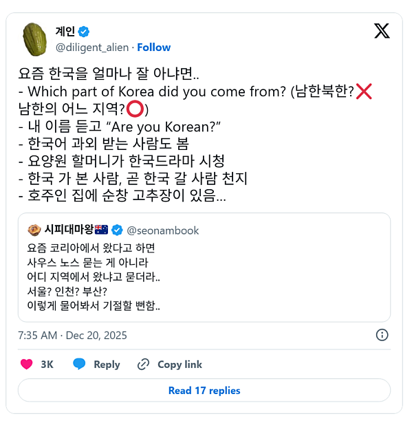 외국에서 한국어 함부로 하면 안 되는 이유 작성자 정보 하프라인 작성 작성일 2025.12.22 02:09 컨텐츠 정보 4,131 조회 목록 본문 이제 한국에서 왔다고 하면 노쓰? 사우쓰? 묻는게 아니라 서울, 부산 등 지역을 묻는다네요.한국과 전혀 상관없는 게시물에서도 shibal my life 같은 표현은 너무 많이 보인다고 크크크 관련자료 댓글 0 등록된 댓글이 없습니다. 로그인한 회원만 댓글 등록이 가능합니다. 목록